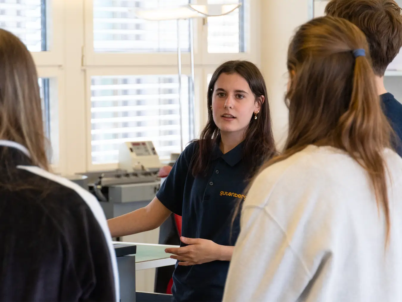 Anschliessend ging es in den Digitaldruck, wo der zuvor gestaltete Einband produziert wurde. Danach konnten die Jugendlichen ihr eigenes Notizheft mit einer Wiro-Bindung fertigstellen. Anerkennung verdient insbesondere unsere Lernende Livia, die sich im ersten Lehrjahr befindet. Sie stellte die Abteilung selbstständig vor und betreute die Gruppen kompetent durch den gesamten Prozess. Die Gutenberg AG ist stolz auf das grosse Engagement und die professionelle Umsetzung von Livia – sie hat diese Aufgabe mit viel Motivation, Fachwissen und Selbstständigkeit gemeistert.